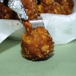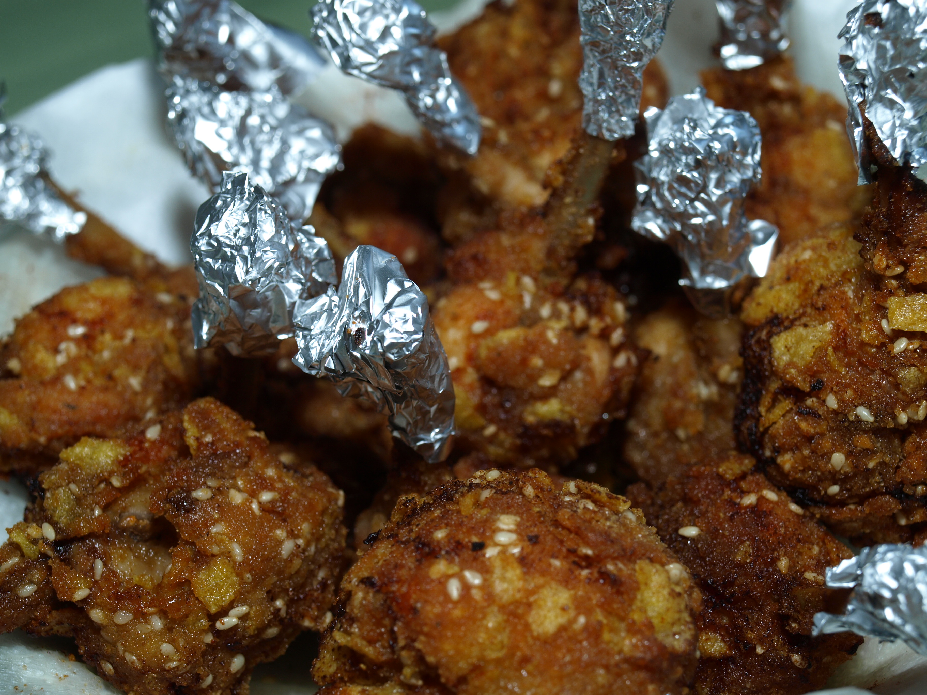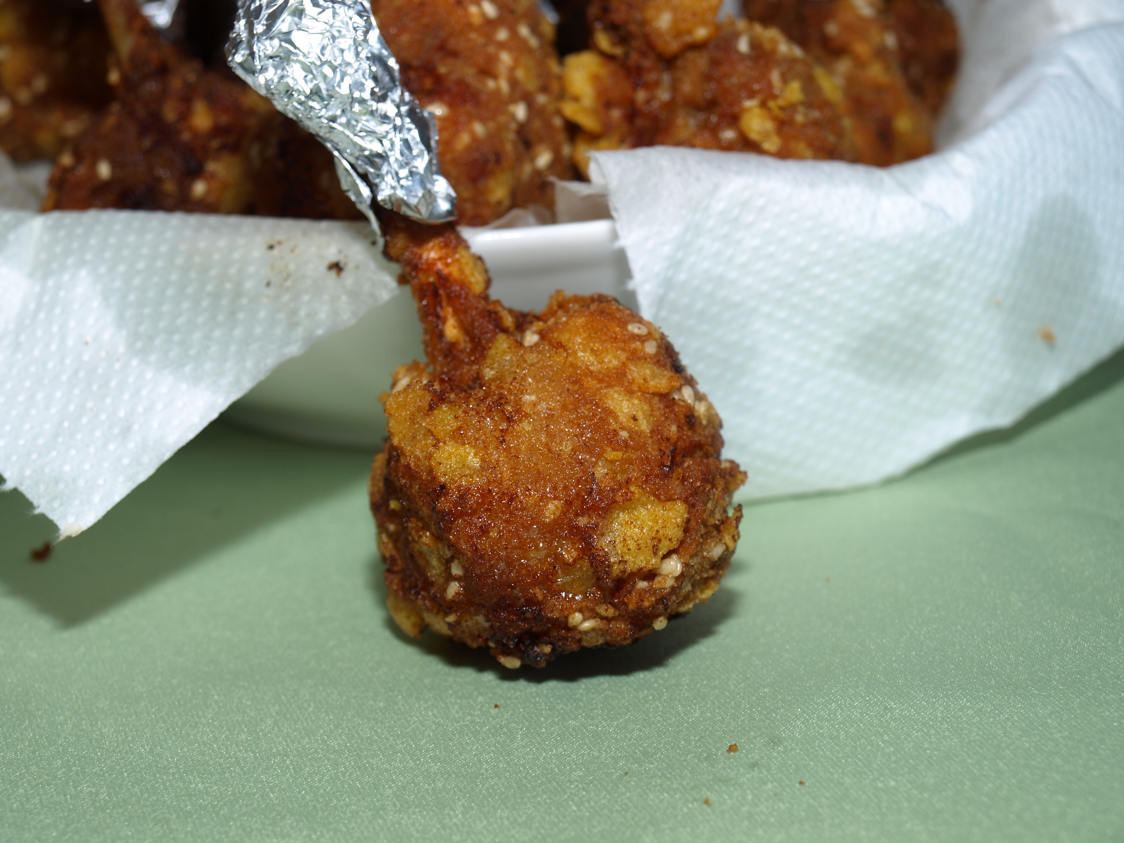 Urmeaza partea finala: se dau acadelele de aripioare prin faina, apoi prin ou batut si la final prin mestec de susan, fulgi de porumb si pesmet. Ar fii bine ca uleiul in care se prajesc aceste Chicken Lollipop sa dea peste aripioare si sa aveti grija sa fie parjite si in interior nu numai la suprafata.