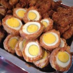 Reteta de oua scotiene intra in categoria de aperitive speciale, aperitive pentru musafiri pretentiosi. Aceste oua scotiene sunt de efect pe masa, dar si foarte, foarte gustoase. Mie imi place sa folosec carne din carnati putin picanta, dar se poate folosi orice carne tocata care se condimenteaza ulterior, dupa preferinte.