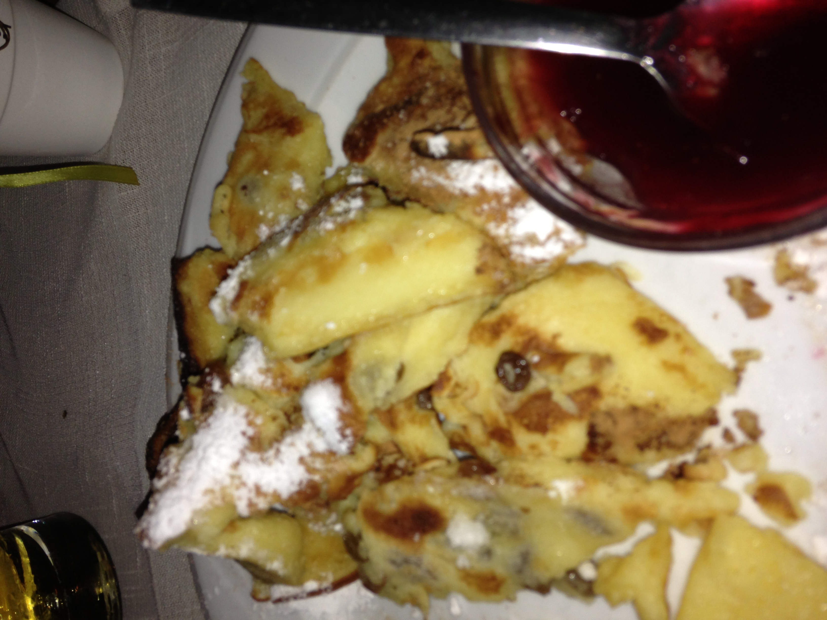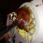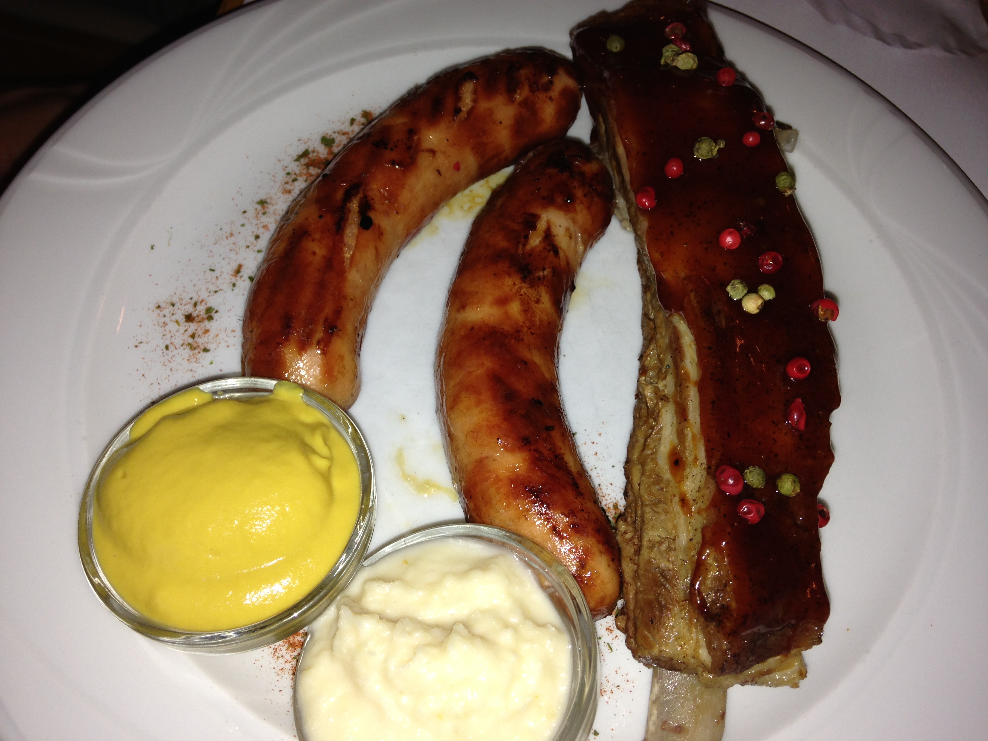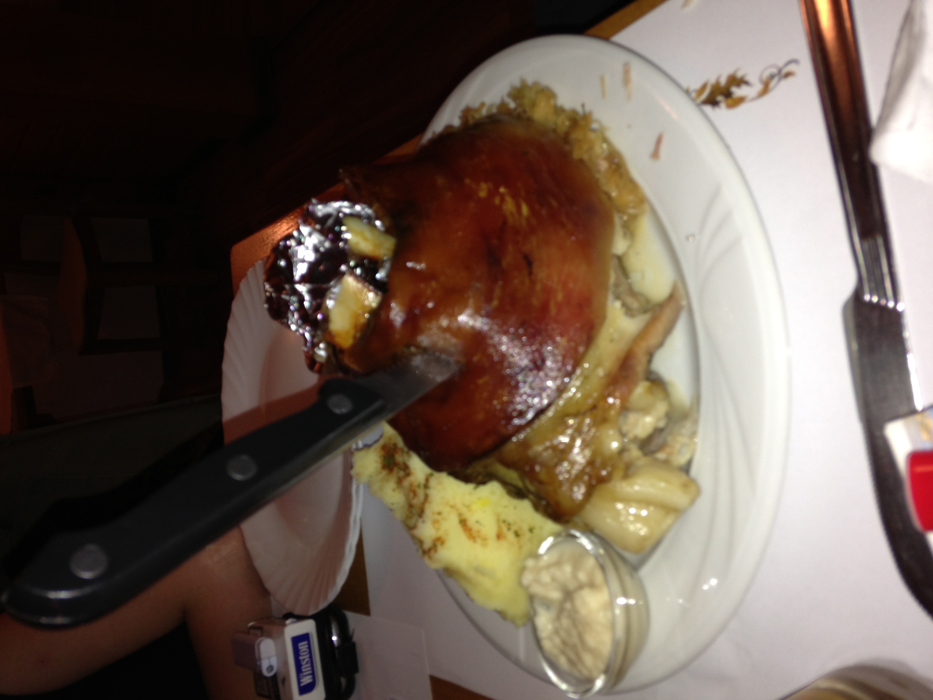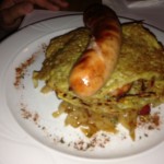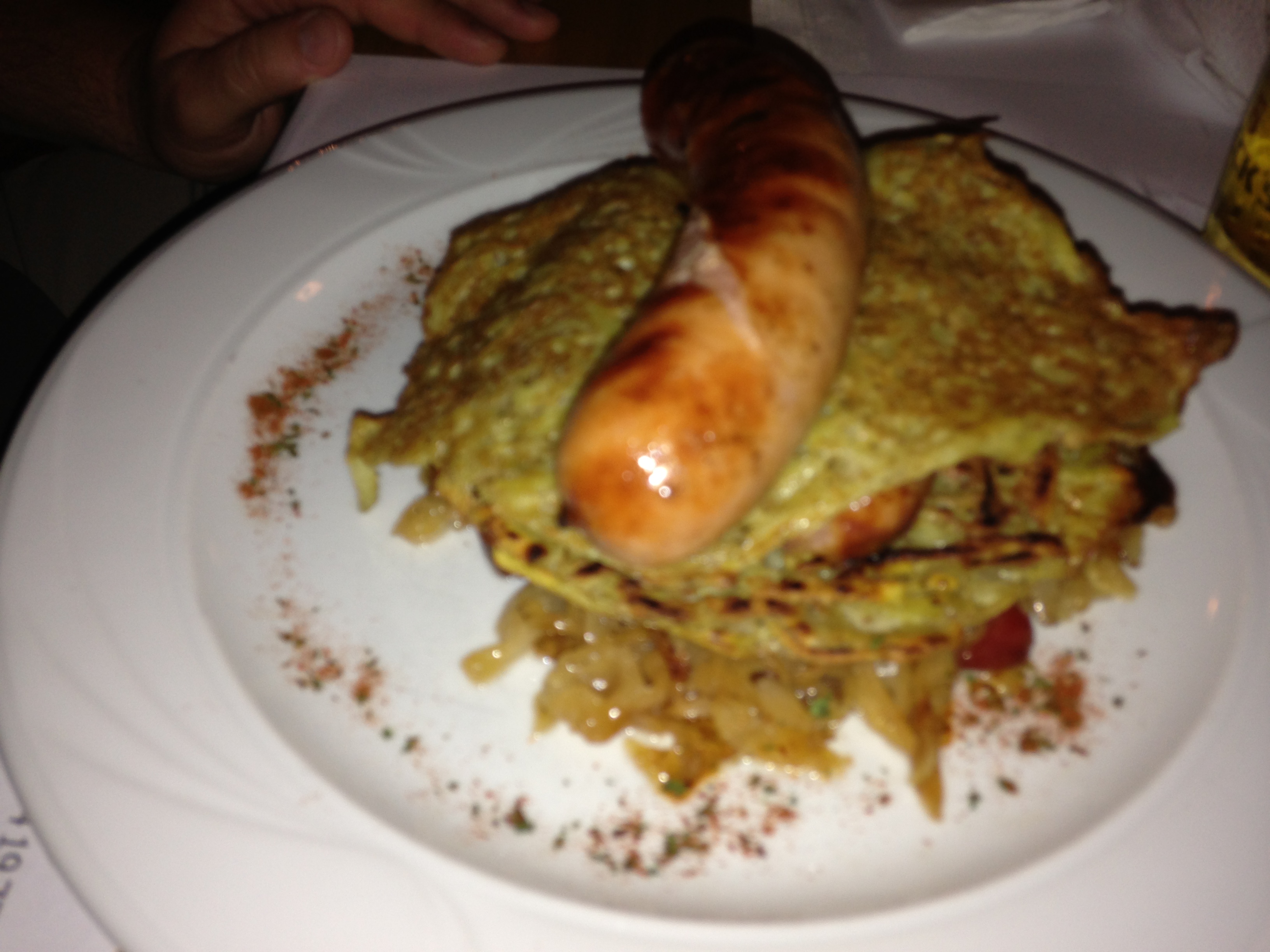 Deoarece berea buna cere mancare pe masura restaurantul german din Cluj are un meniu variat pe baza de carne, carnati  si multe altele la care se pot adauga diferite garnituri de la varza rosie pana la fasole. Personal nu m-a satisfacut oferta de deserturi, am incercat specialitatea Kaiserschmarrn (un fel de bucati de clatite mai groase cu gem si zahar vanilat) insa nu e nmic special. Apropo’ de mancare cel mai mult mi-au placut carnatii, varza si supa gulas; sunt bune si supa crema de usturoi, dar nu la fel ca cea din Ungaria, ciolanul e imens insa la costite sa va asteptati la portie mai mica.