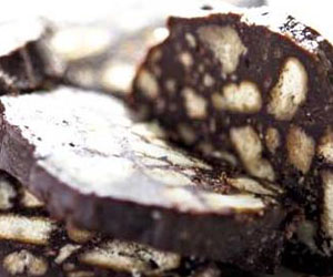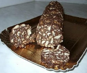 Ceaiul si zaharul caramelizat se pun peste biscuiti, dar sa nu fie prea cald si nici prea mult cat se se inmoaie. Le final se ruleaza pe o folie de ceolofan „salamul”si se pune la rece.