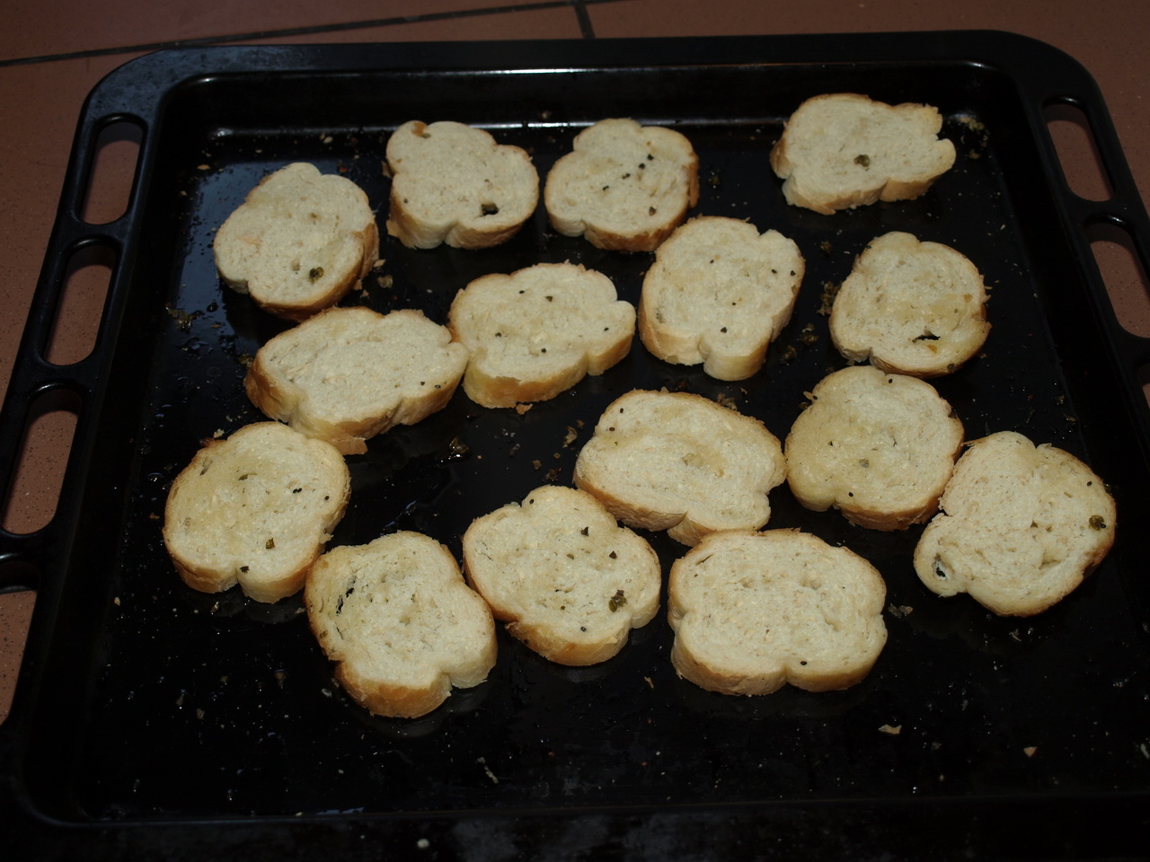 Urmeaza partea a doua: tartinele. Se taie bagheta de paine felii si se pune intr-o tava, se presara busuioc si ulei de masline apoi se baga la cuptor pana incep sa se rumeneasca.