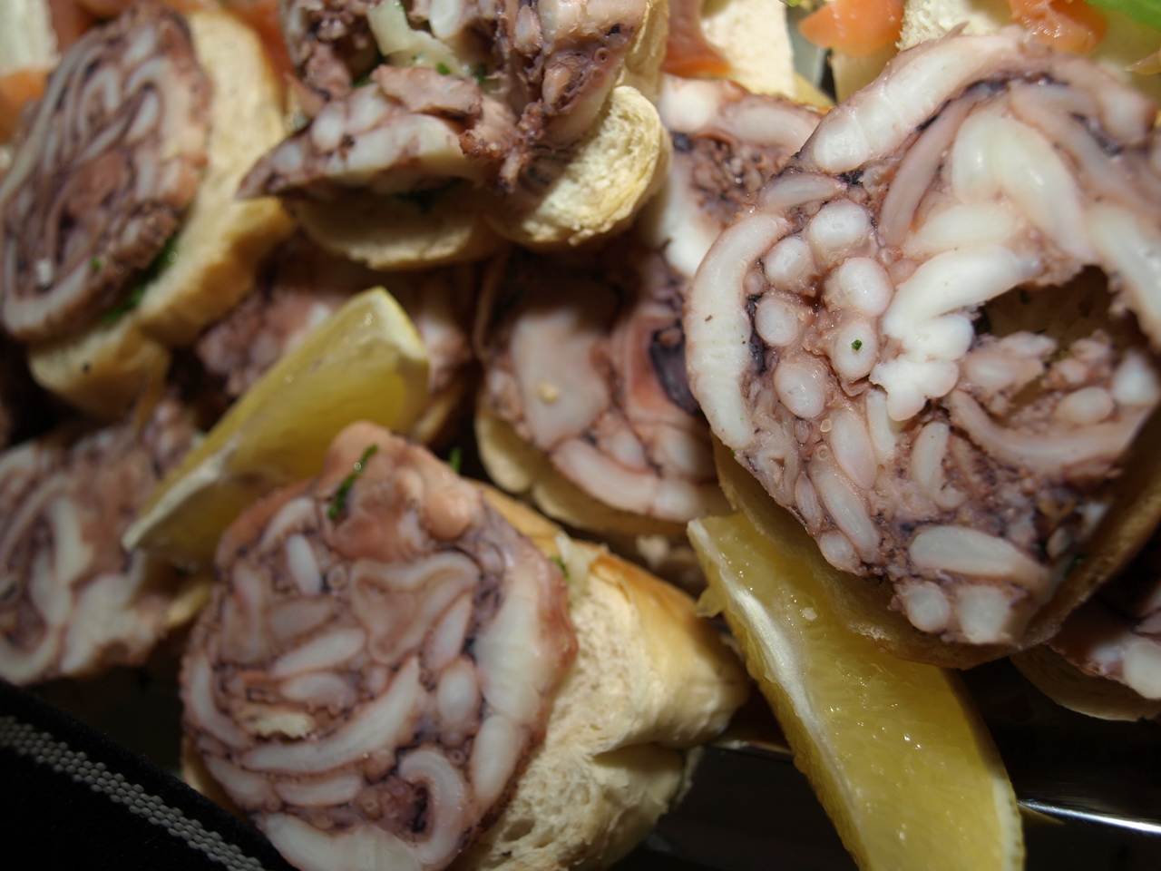 Urmeaza montarea tartinelor cu carpaccio de caracatita altfel: painea stropita cu putin sos gremolata, o bucata de salata verde si o felie de carpaccio .