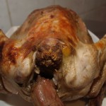 Se tine curcanul la cuptor circa 4 ore la o temperatura de 200 grade celsius, timp in care se stropeste cu apa din tava (eu l-am intors de doua ori de pe o parte pe alta.). Spre final am dat jos folia de aluminiu si am golit apa din tava pentru a lasa curcanul sa se rumeneasca.