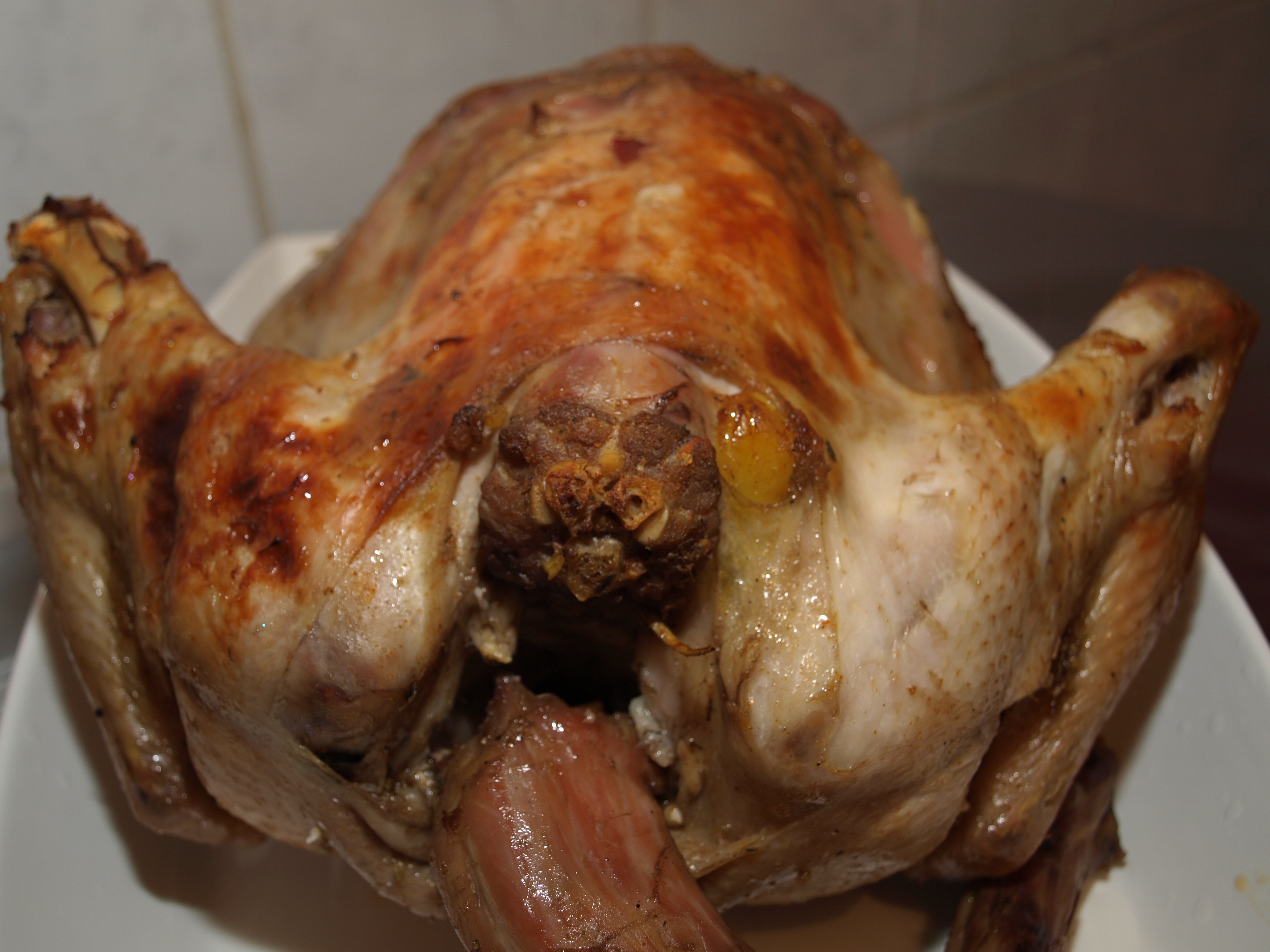 Va prezint o reteta de curcan tinut in saramura, marinat, umplut si preparat la cuptor. Pentru ca nu am comandat din timp un curcan proaspat a trebuit sa folosec unul congelat, dar nu a fost un impediment, am folosit un curcan de 5,2 kg pe care l-am tinut o zi sa se dezghete incet.
